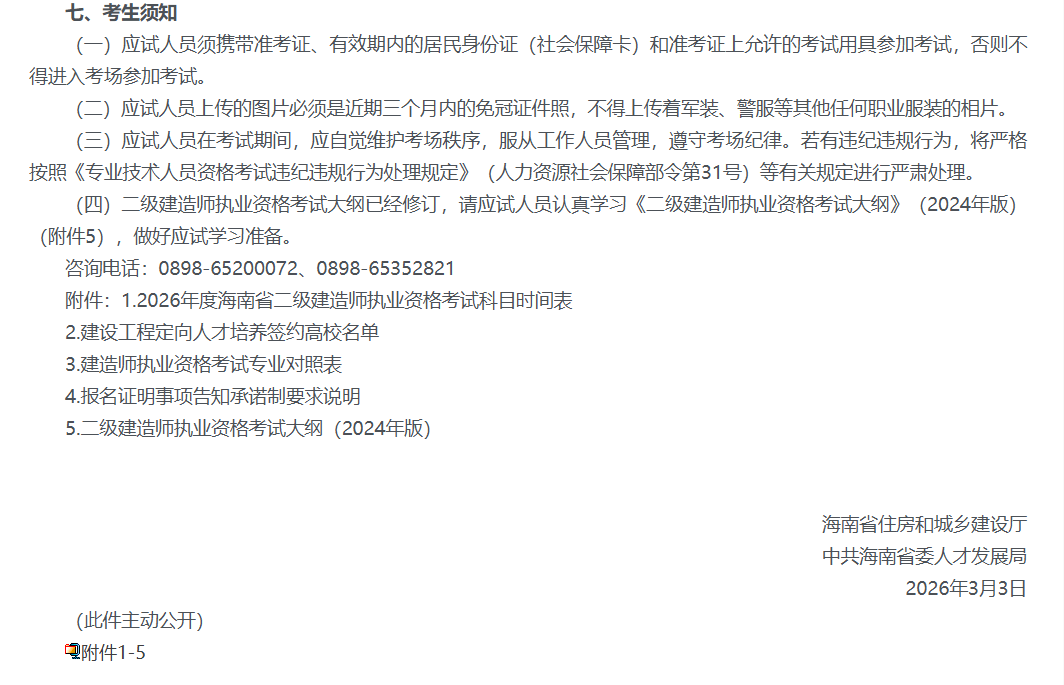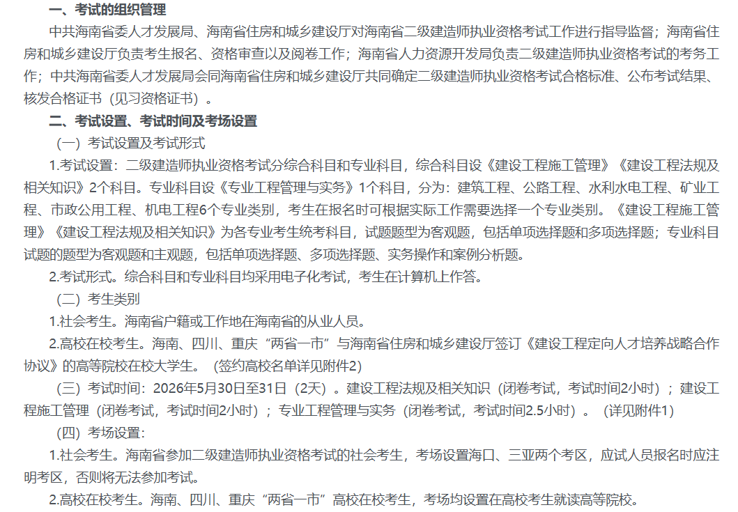 海南省住房和城乡建设厅 中共海南省委人才发展局 关于做好2026年度二级建造师执业资格考试工作的通知
