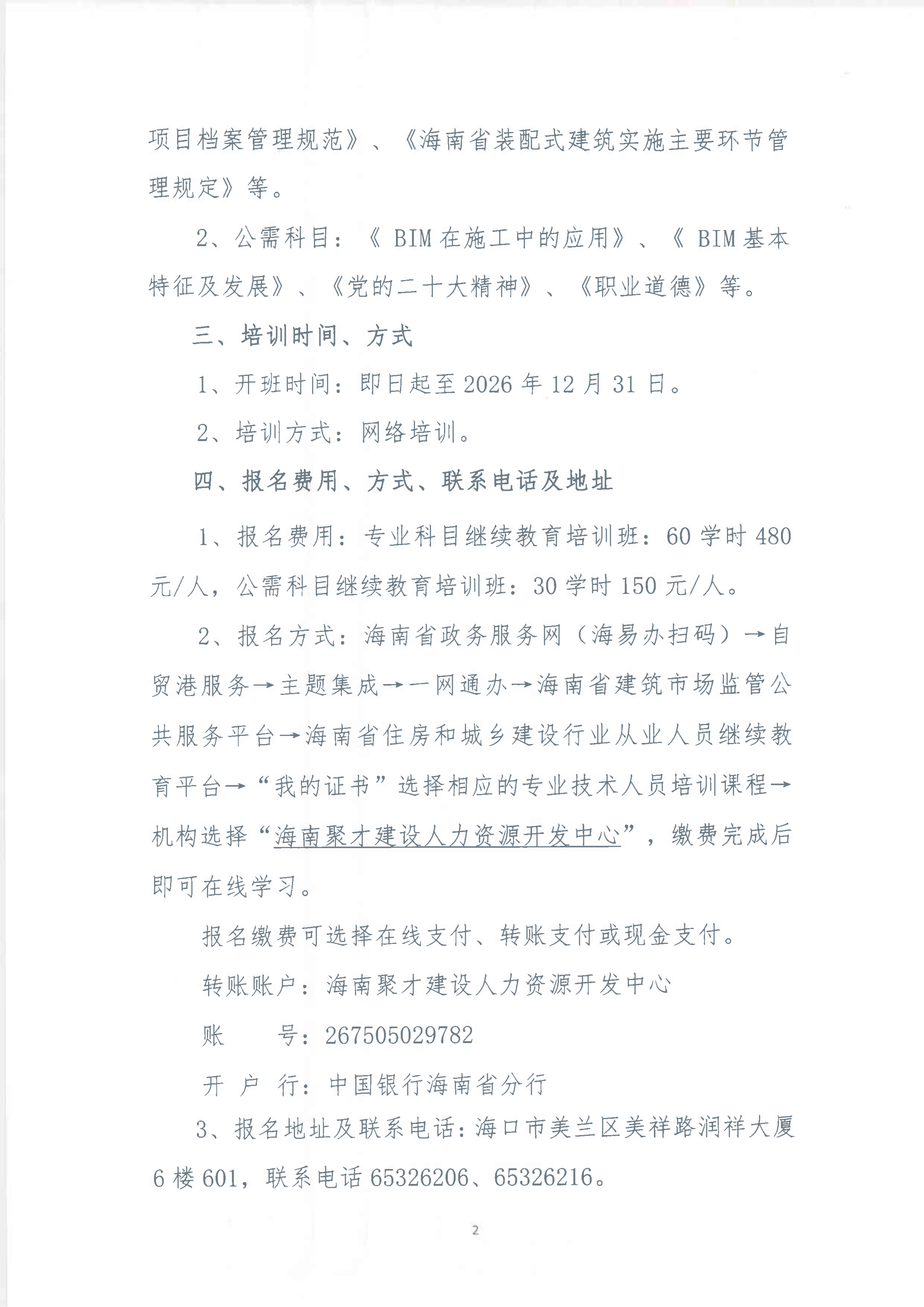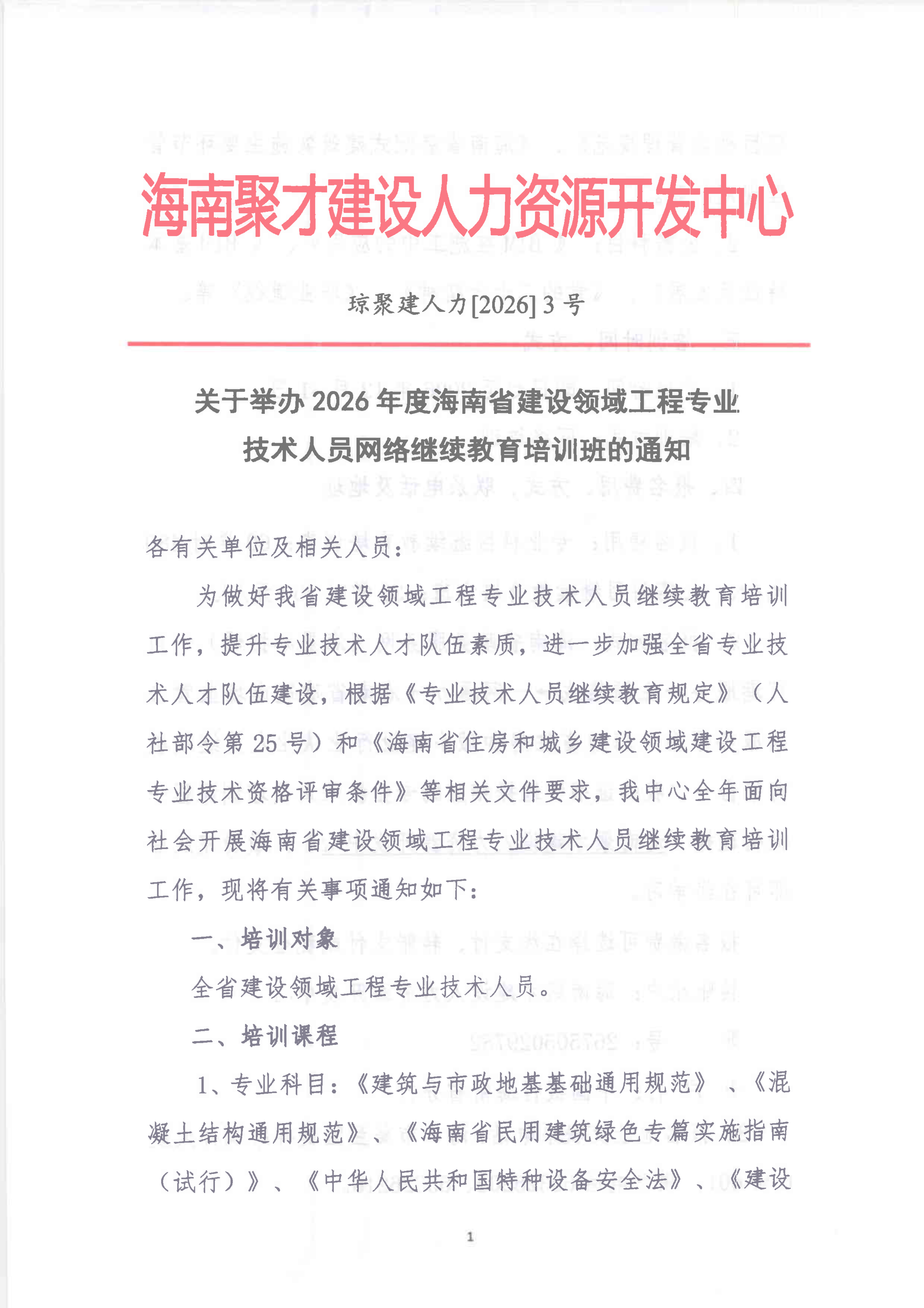 关于举办2026年度海南省建设领域工程专业技术人员网络继续教育培训班的通知