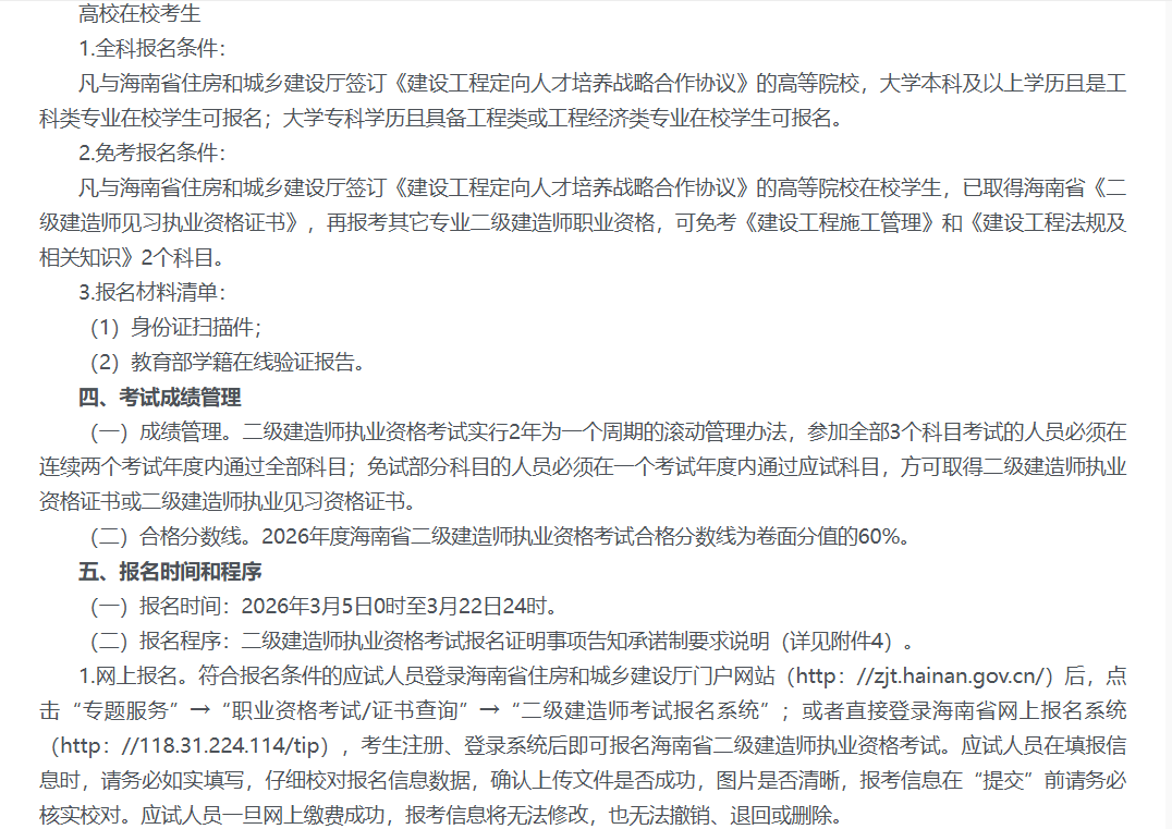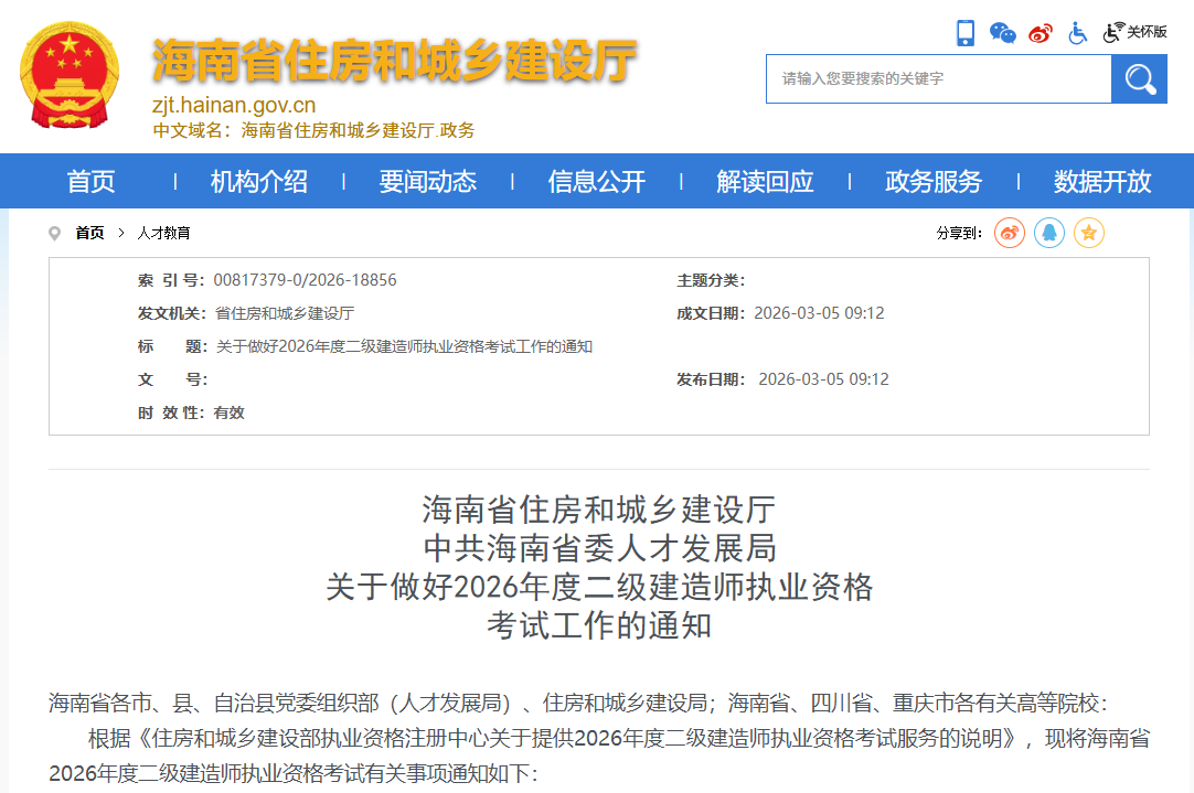 海南省住房和城乡建设厅 中共海南省委人才发展局 关于做好2026年度二级建造师执业资格考试工作的通知
